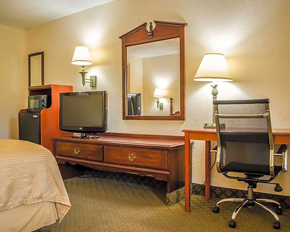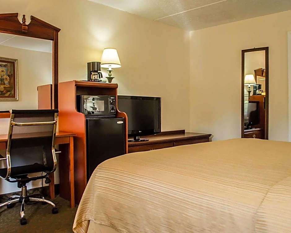 This room features a 32-inch flat-screen TV, coffee machine, microwave, and small refrigerator.